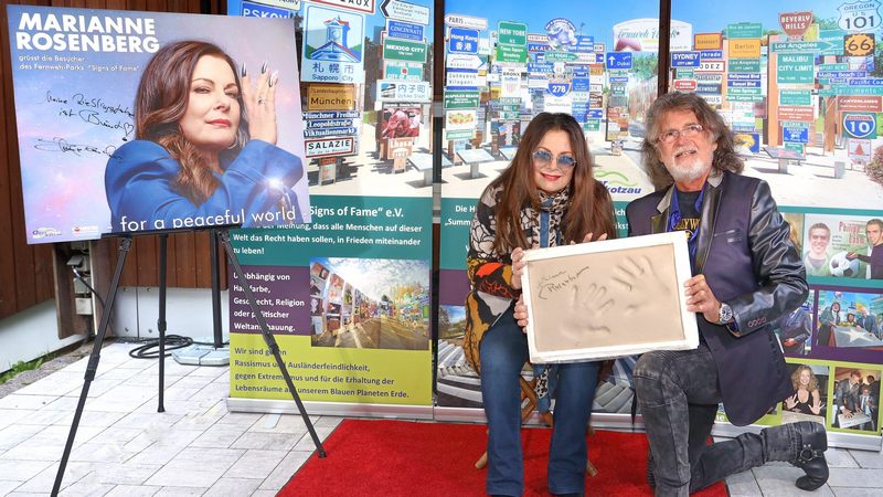 Doch die Aufnahme in die „Signs of Fame“ ist noch nicht vollendet. Was folgt ist die wichtigste Pose des Shootings, das Friedenszeichen. Denn mit den Handabdrücken in Ton werden die Stars nicht nur geehrt für ihre Erfolge in den Genres Musik, Film, TV, Bühne oder Sport, sondern heben damit vor allem, wie eingangs bereits erwähnt, symbolisch die Hand gegen Rassismus, gegen Antisemitismus, gegen Rechtsextremismus und für eine friedvollere Welt. Und da macht die Schlager-Ikone Marianne Rosenberg natürlich gerne mit.