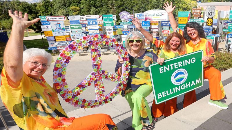 Klaus ist sofort verknallt in dieses PEACE ZEICHEN, das für ihn ein Lebensgefühl ist, das bis heute anhält. Und so muss das Zeichen, das auch über den Fernweh-Park steht mit „for a peaceful world“, natürlich mit zum Shooting vor die Schilderreihen. Und als Klaus 2023 und 2024 mit seinen beiden OLDIE-Musik-Parties das Amphitheater im Fernwehpark rockte, musste eine Hymne der damaligen Flower Power Zeit natürlich sein – der Song von John Lennon und Yoko Ono: „Give peace a chance“. Deshalb absolvierte Klaus mit dem PEACE Zeichen nach der offiziellen Schildübergabe von BELLINGHAM noch eine ausgiebige Fotosession nur mit diesem Zeichen – wie man in der Bilderstrecke sieht.