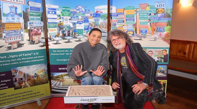 Doch die Aufnahme in die „Signs of Fame“ ist noch nicht vollendet. Was folgt ist die wichtigste Pose des Shootings, das Friedenszeichen. Denn mit den Handabdrücken in Ton werden die Stars nicht nur geehrt für ihre Erfolge in den Genres Musik, Film, TV, Bühne oder Sport, sondern heben damit vor allem, wie eingangs bereits erwähnt, symbolisch die Hand gegen Rassismus, gegen Antisemitismus, gegen Rechtsextremismus und für eine friedvollere Welt. Und da macht Amira Aly natürlich gerne mit.